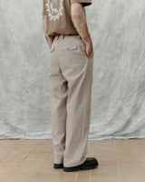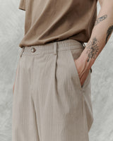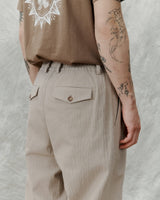 Voluminous, wide and full-length fit, with elastic waistband. back pocket flaps and transparent buttons for a clean expression. The Alive trouser is a cut from seersucker weave.